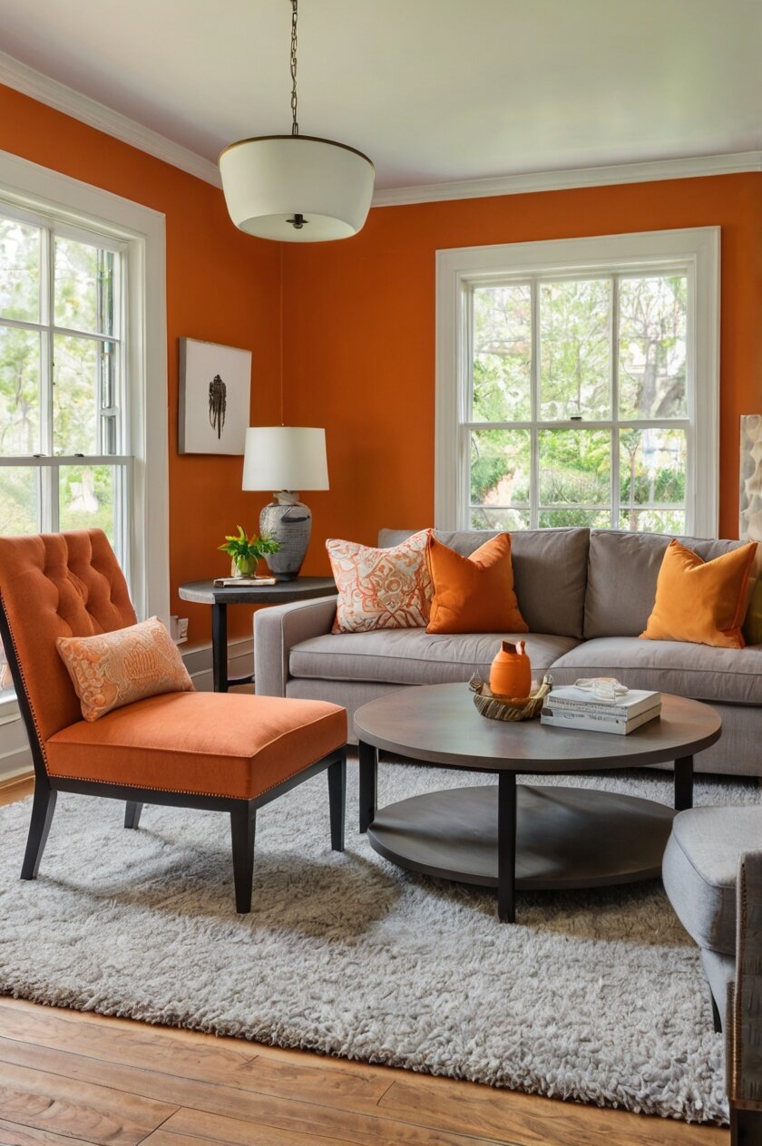 Charcoal or darker gray carpets pair beautifully with deeper orange tones like rust or burnt orange.