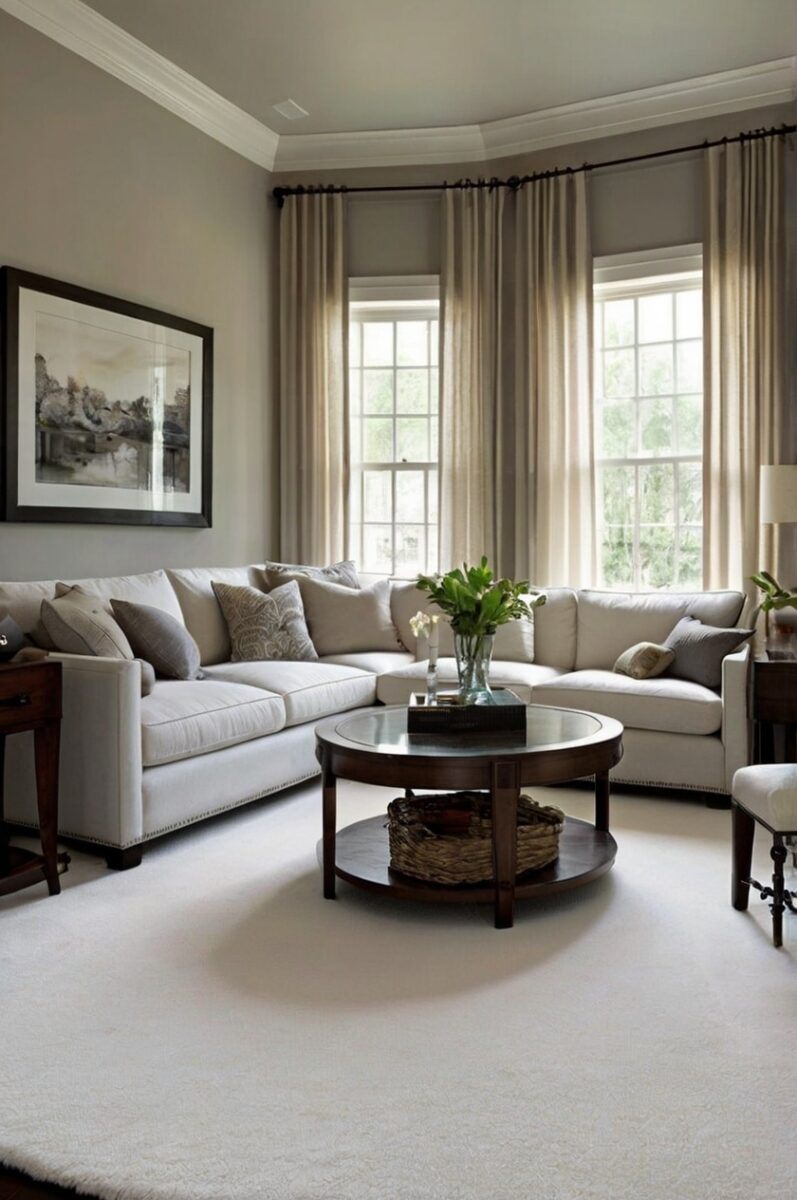 Cream carpet with a subtle pattern creates visual interest while maintaining a light, airy feel that complements Revere Pewter walls perfectly.