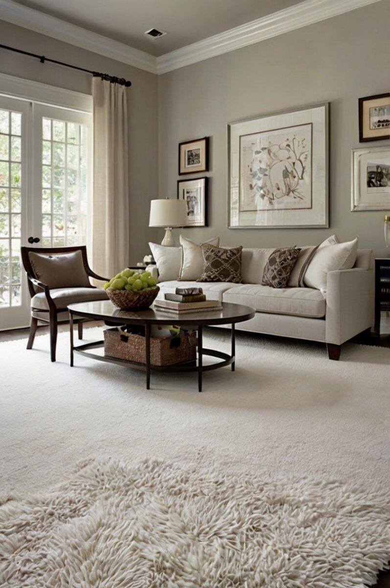 Your white carpet doesn’t have to be bright white – options with slight cream or ivory undertones can soften the contrast while still maintaining the clean look.