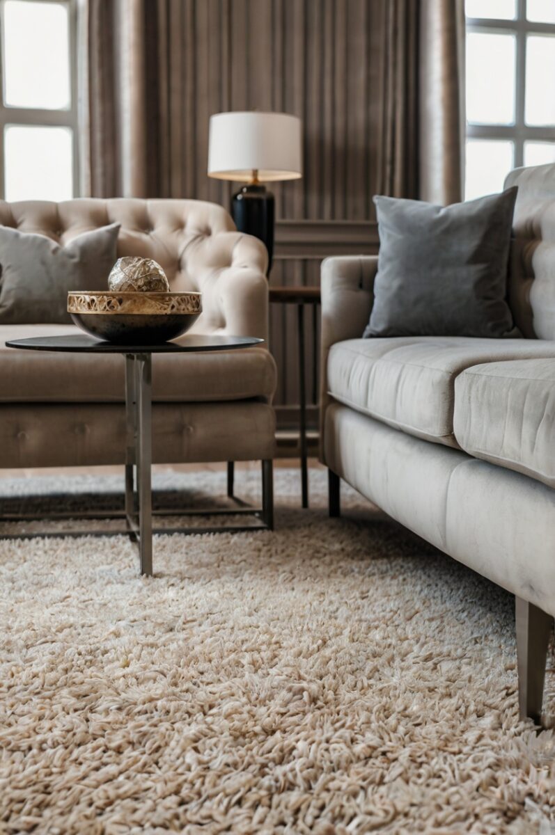 Beige carpet paired with a silver gray sofa creates a harmonious, warm foundation that feels both sophisticated and inviting.