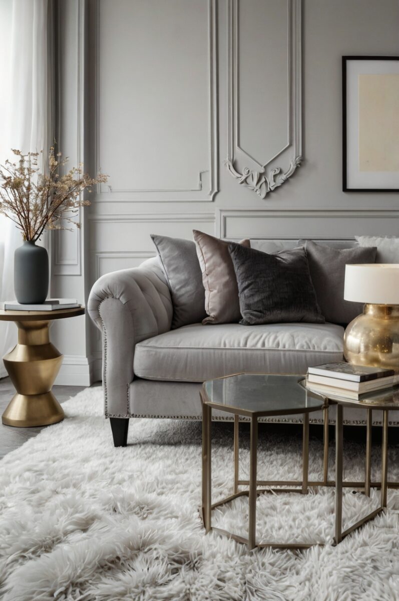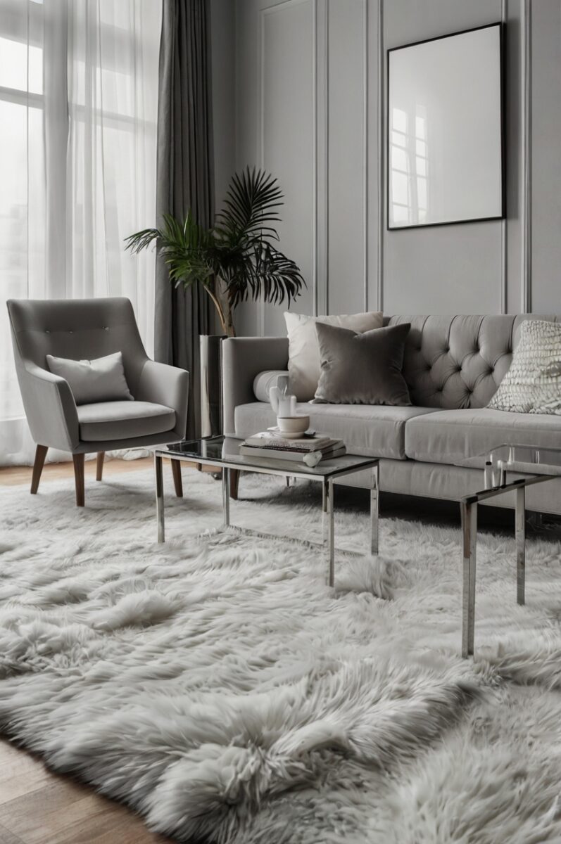 When styling your space, consider adding natural elements like wooden side tables or woven baskets to bring warmth to the white-and-gray color scheme.