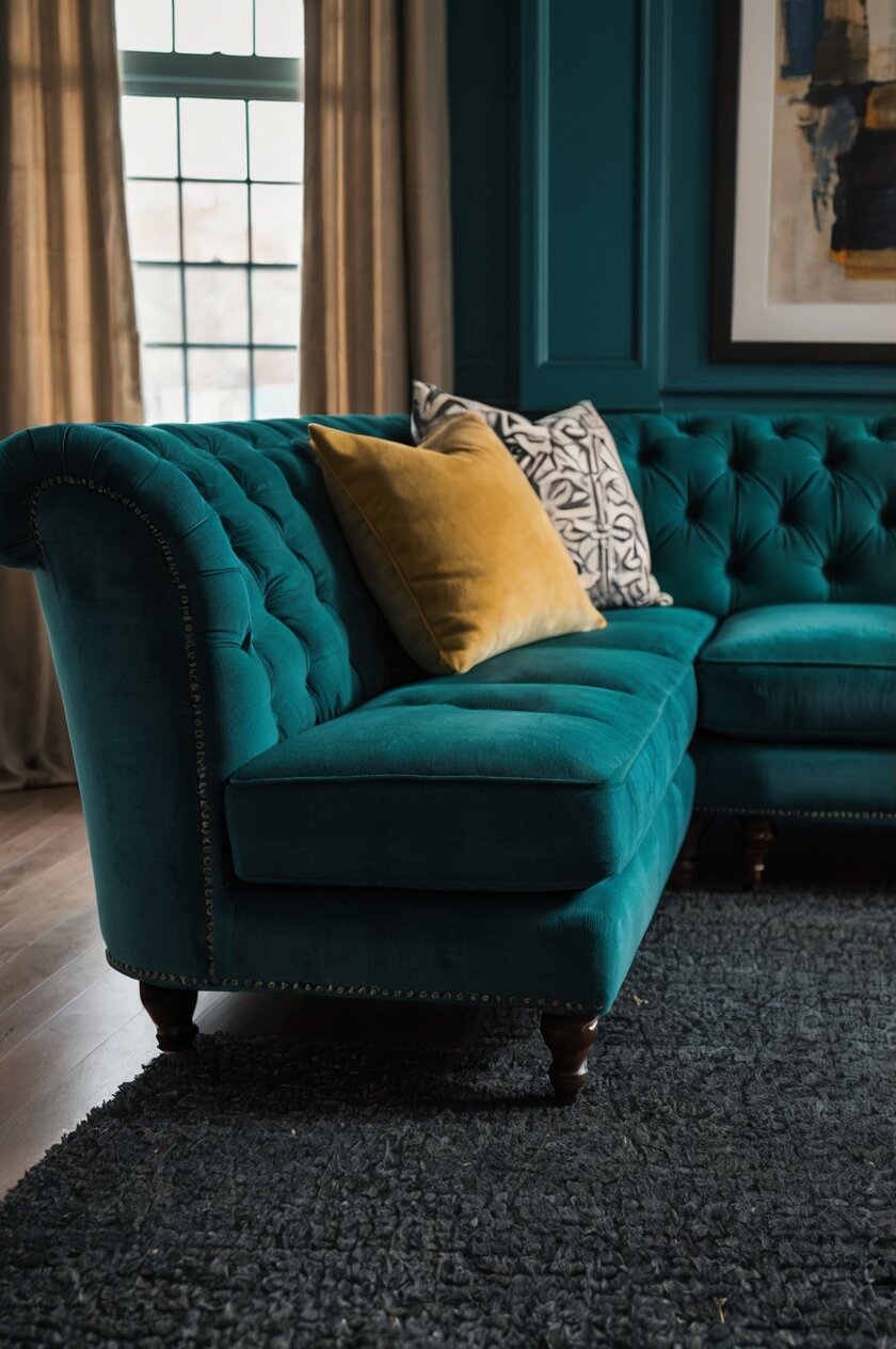 Pairing your teal sofa with a black carpet creates a bold, dramatic statement that feels both modern and timelessly sophisticated.