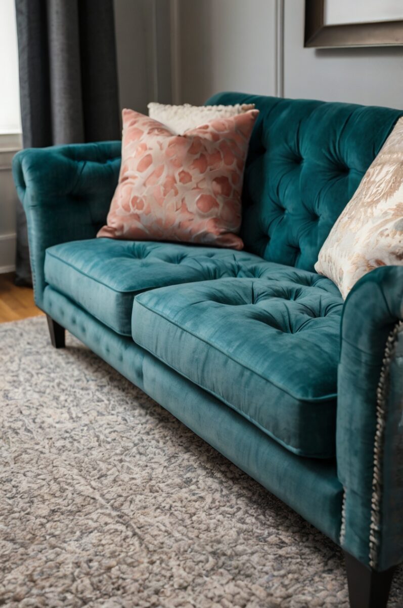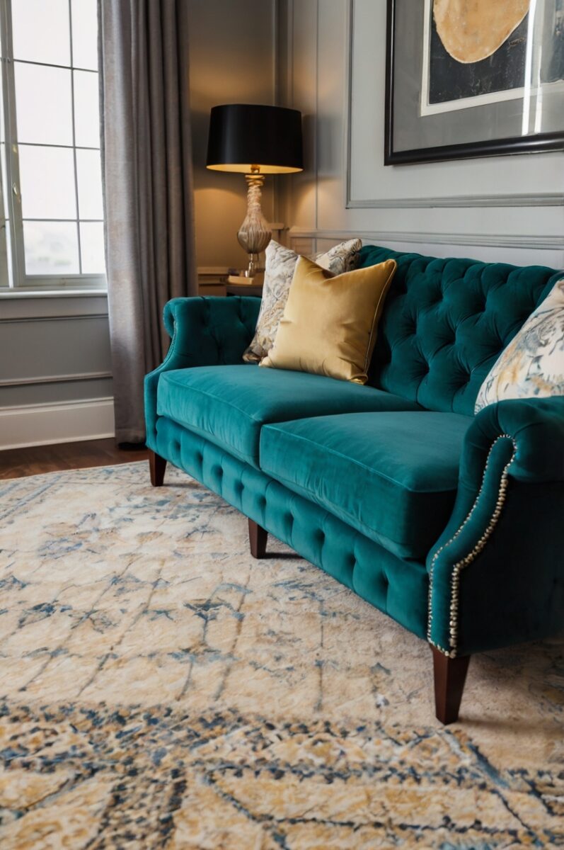 The right carpet color can highlight your teal sofa’s vibrant personality while creating a harmonious balance throughout your room.