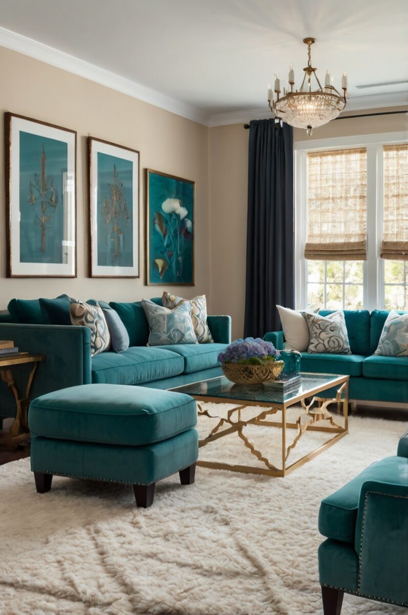 For a cohesive design, consider incorporating both teal and warm gray in your accessories throughout the space.