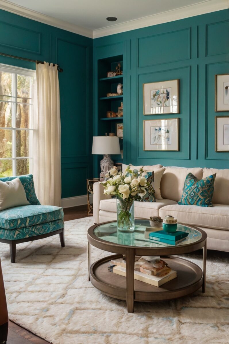 Cream or ivory carpet creates a soft, timeless foundation that allows your teal walls to take center stage.