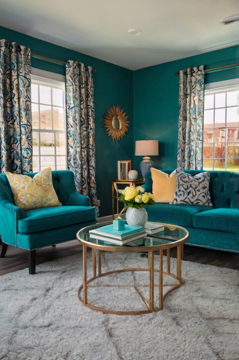 For adding interest while maintaining this color story, incorporate patterns and textiles that feature both teal and yellow throughout the space.