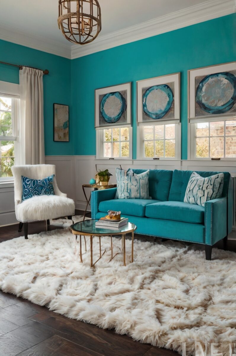 For added visual interest, consider a beige carpet with subtle patterns or texture that complements your turquoise walls.