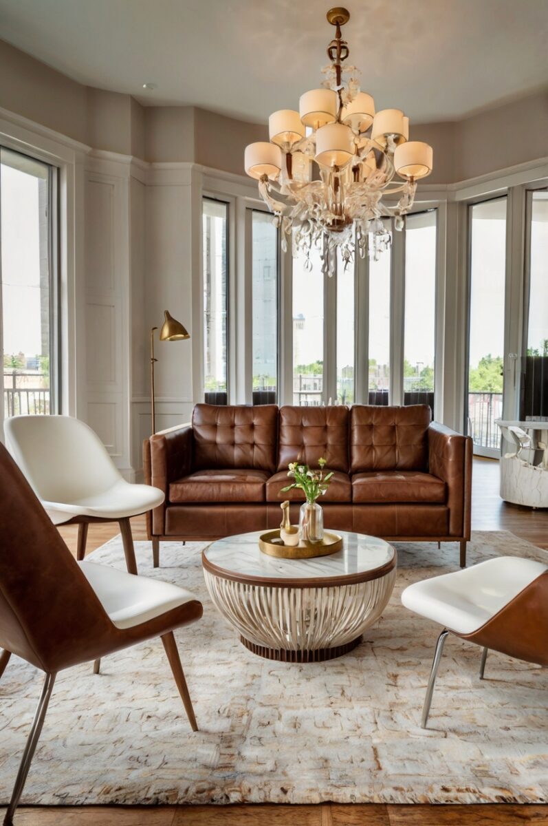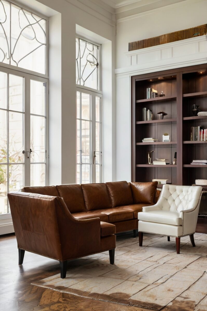 When selecting white chairs, consider the undertone of your brown leather sofa – creamy whites pair well with warm brown leathers, while bright whites complement cooler brown tones.
