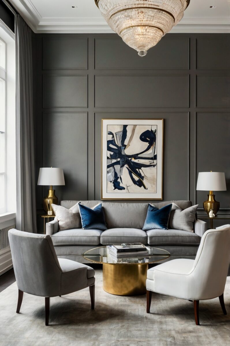 The contrast between a light or medium gray couch and navy chairs creates a striking visual anchor in your living room.