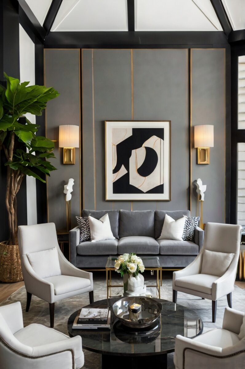 White chairs with gray couches create a perfect canvas for seasonal decor changes, allowing you to update your room’s look with different accent colors throughout the year.