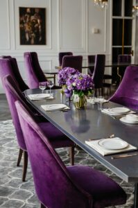 Velvet lavender chairs look particularly stunning, as the material enhances the depth and subtlety of the color.