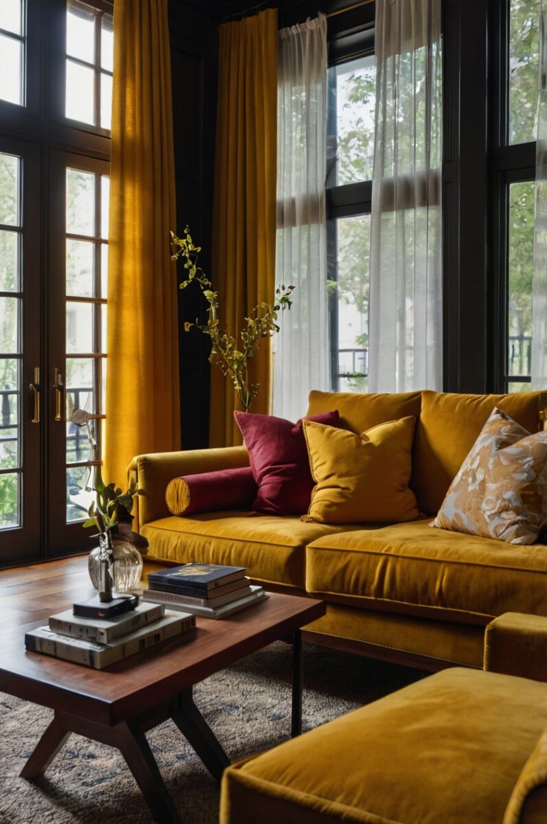 Sunny yellow tones warm a room, but bolder mustard plays especially well off cherry’s reddish undertones.