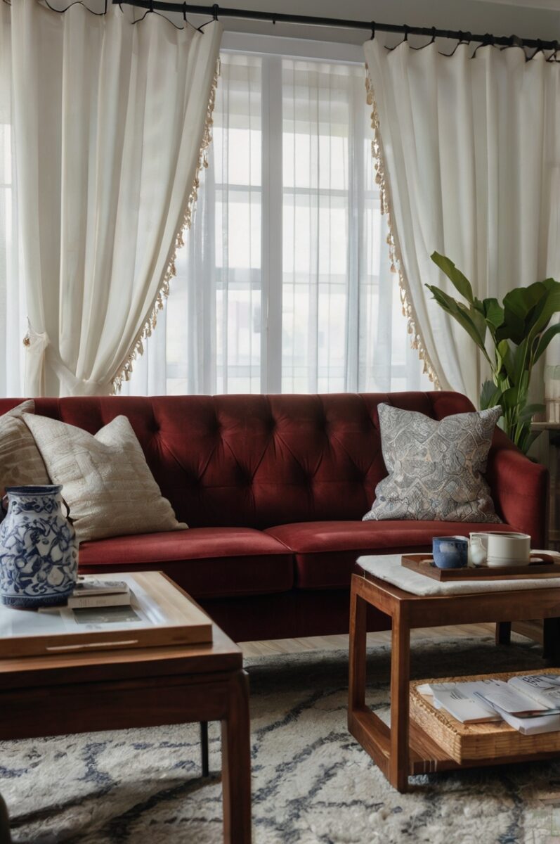 Coastal cottage style flows when teal curtains meet cherry furnishings.