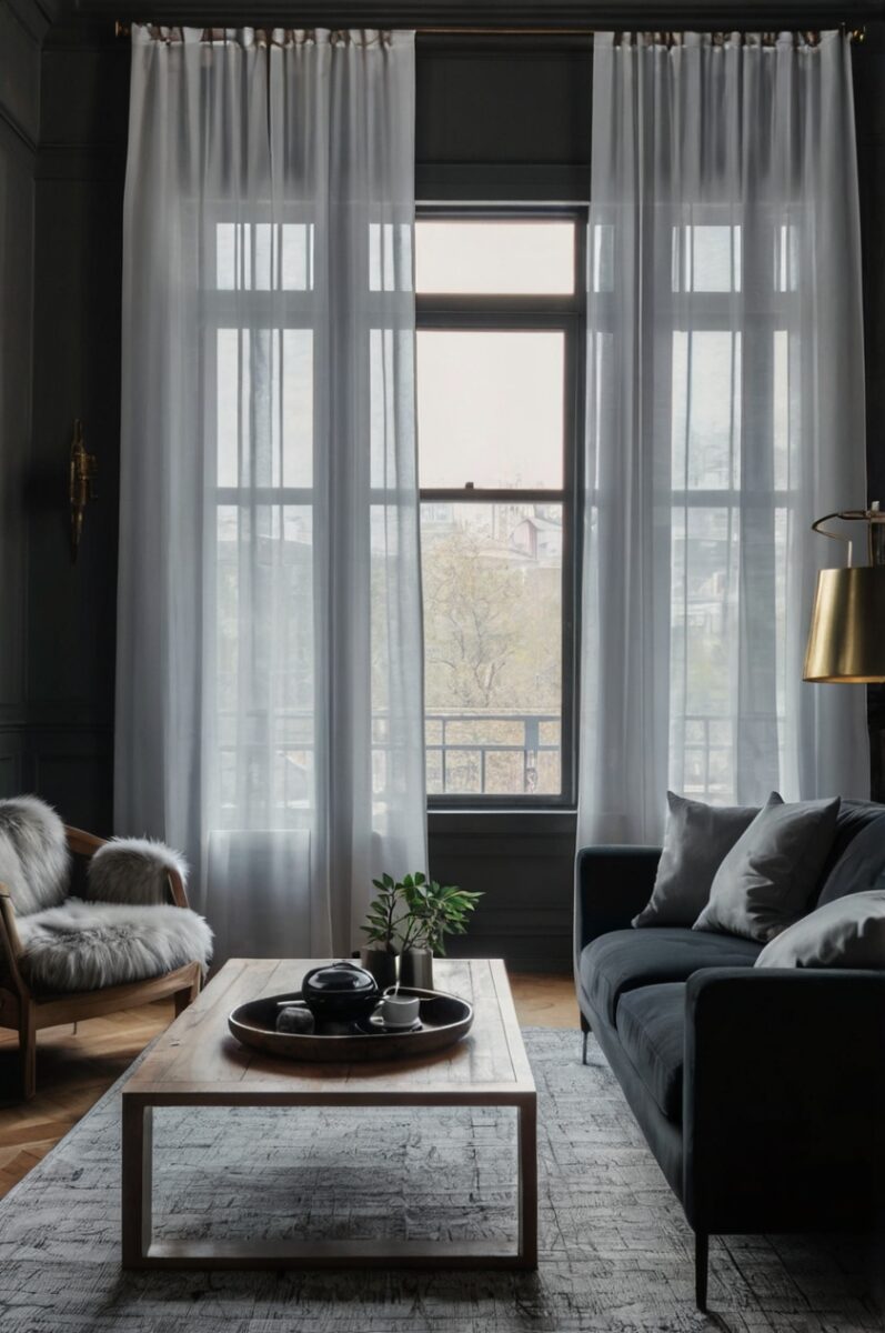 Charcoal gray curtains create a sophisticated, monochromatic look that’s both elegant and modern.
