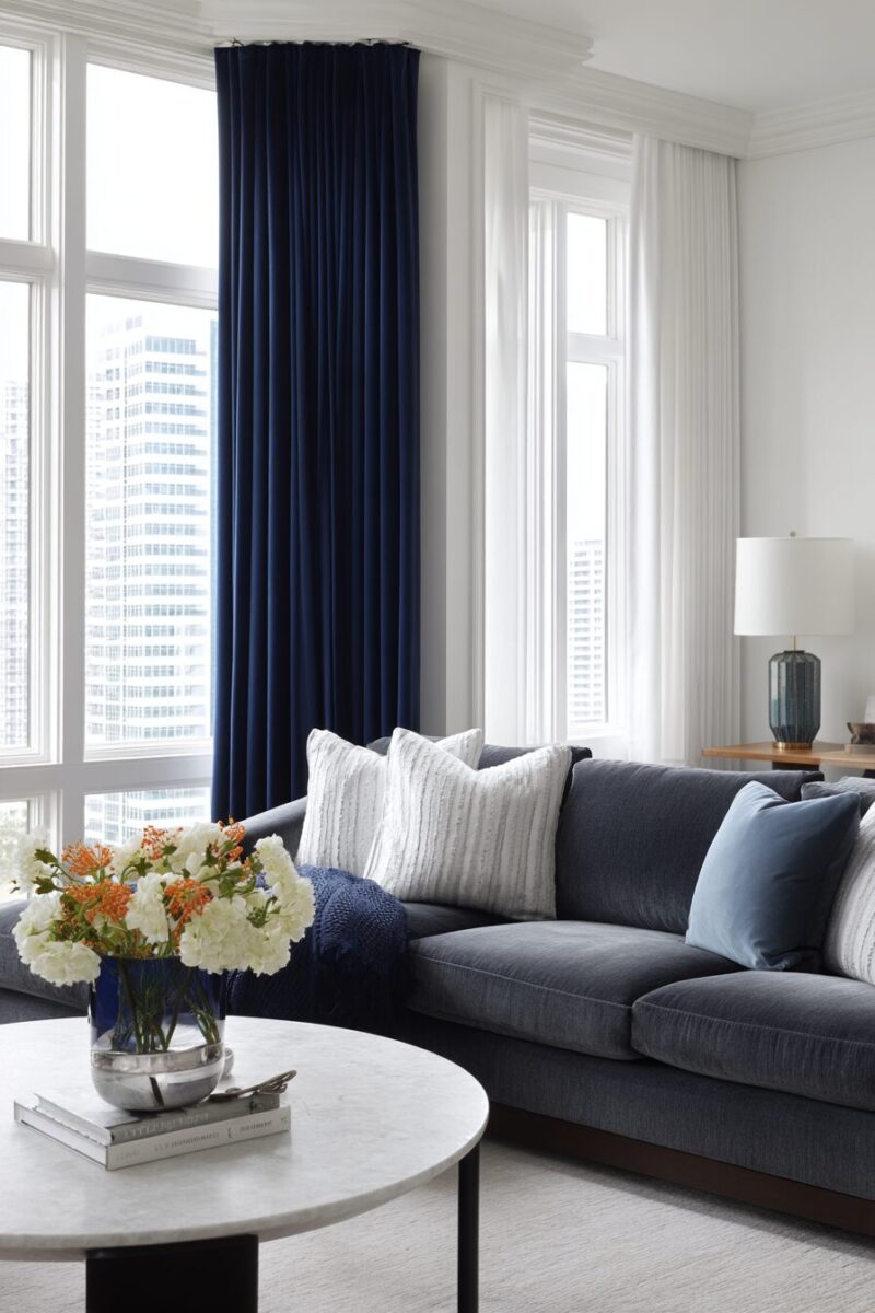 Navy blue curtains create a sophisticated anchor in a room with white walls and a gray sofa.