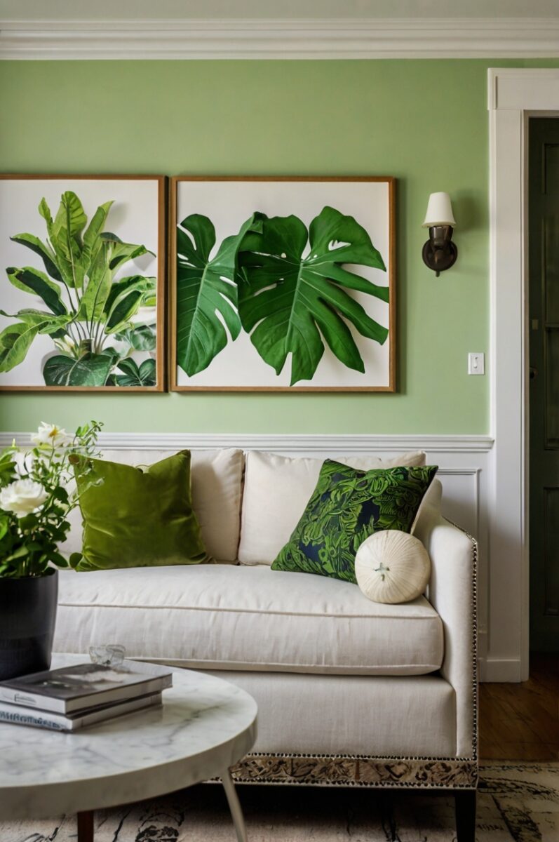 Clear acrylic or glass furniture creates light, airy spaces when paired with green walls.