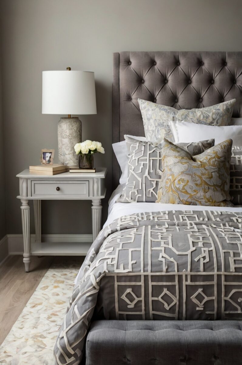 This refined combination works beautifully with light to medium gray beds, where the contrast creates subtle visual interest without harsh transitions.