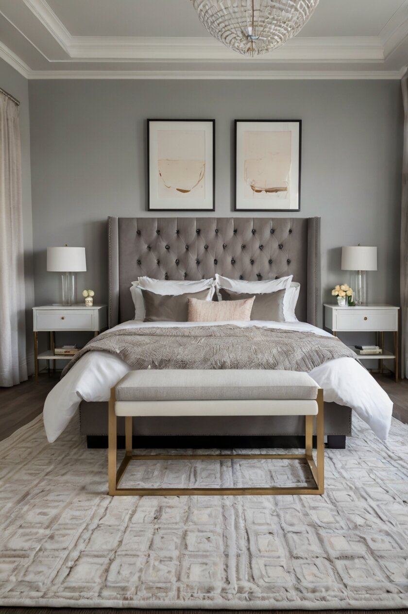 Consider navy blue furniture with subtle details like carved motifs or unique hardware to add interest to your gray bedroom scheme.