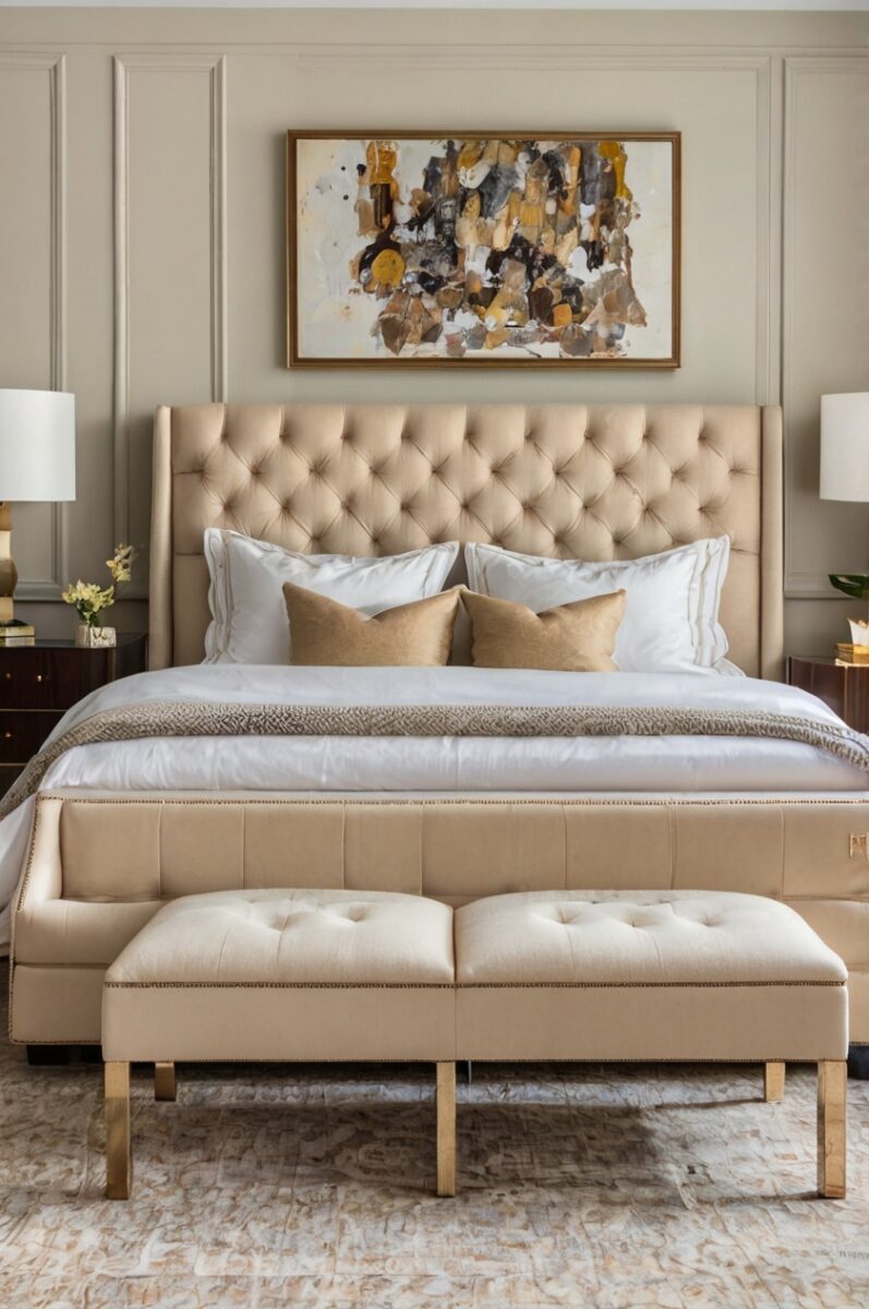 Light gray furniture with a slight sheen or metallic finish can introduce a contemporary edge to your beige upholstered bed without creating jarring contrast.