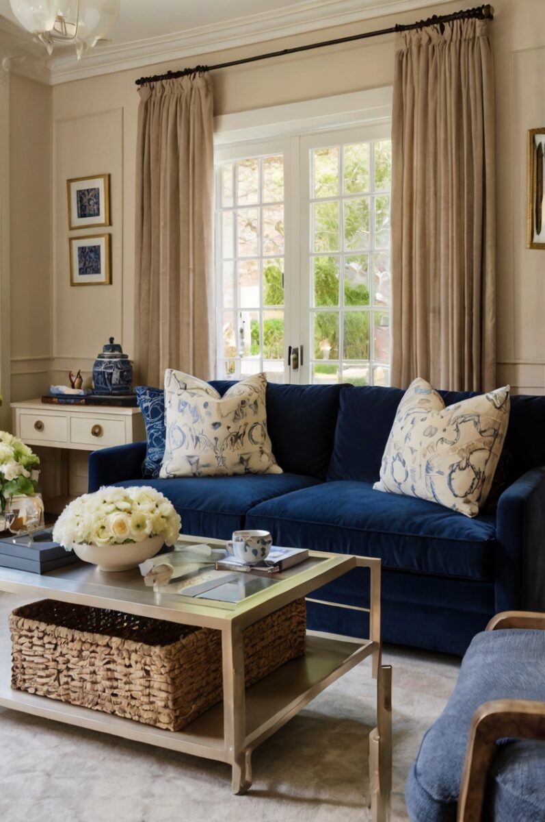 Navy blue furniture against cream walls creates a pairing that exudes both classic charm and contemporary appeal.
