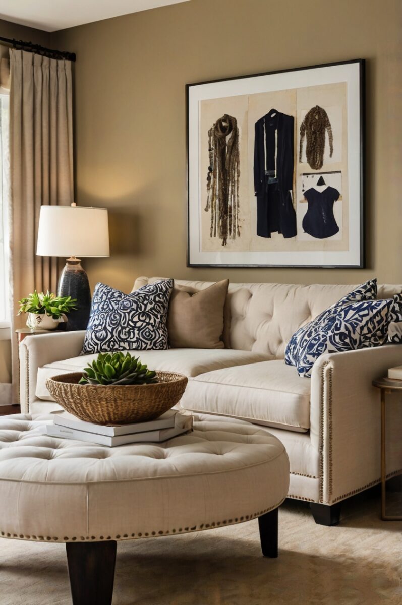 A teal blue sofa or accent chair becomes an eye-catching focal point in a khaki room, adding personality and style to the space.