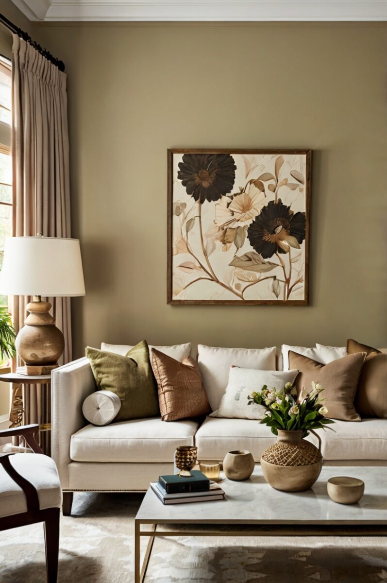 Cream upholstered furniture with subtle patterns looks especially interesting against khaki walls, adding visual texture without bold color.