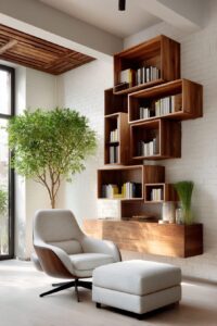 In living rooms, wooden coffee tables, entertainment centers, or bookshelves bring warmth while providing practical storage and display space.