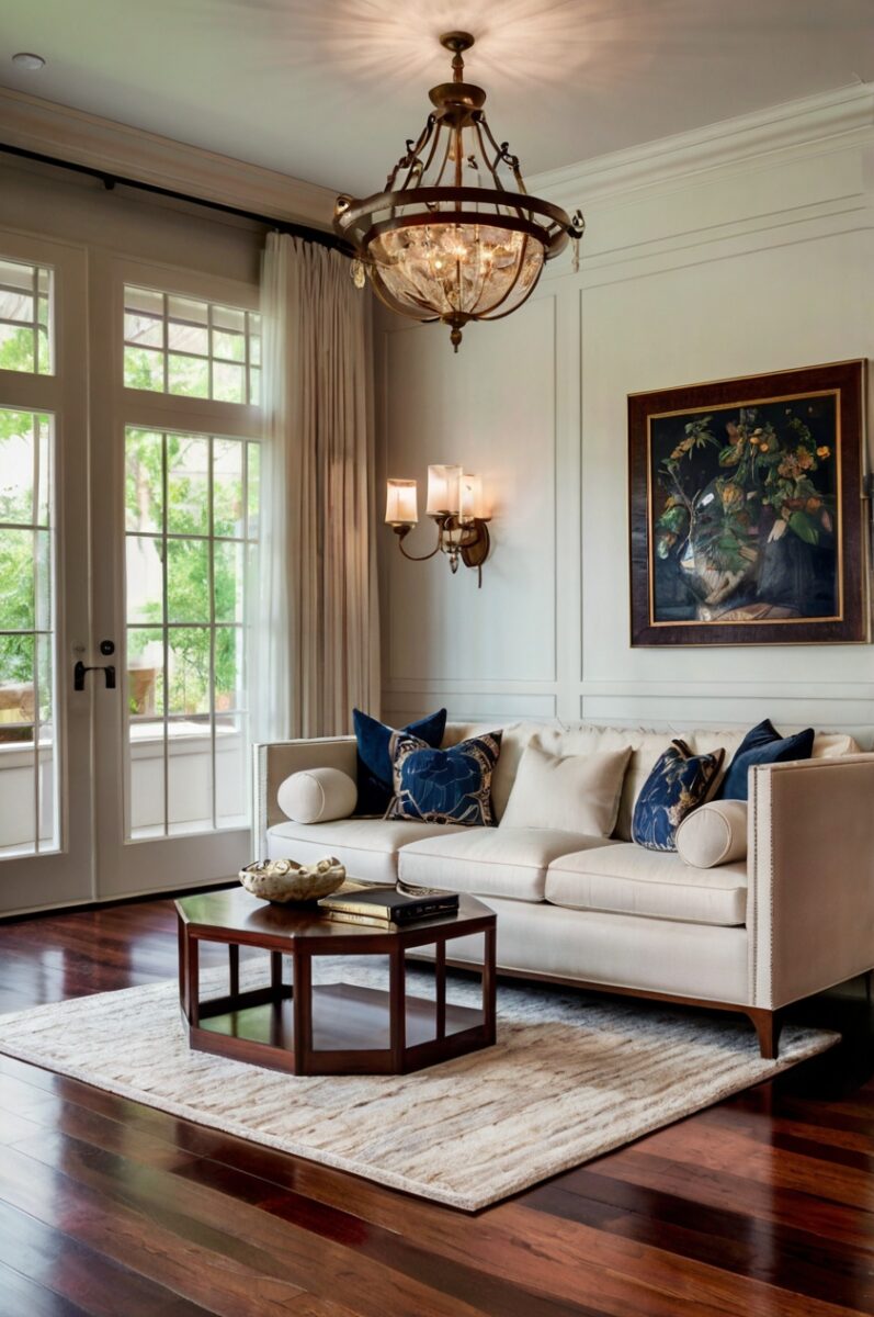 Consider side tables or decorative elements in lighter woods for contrast.