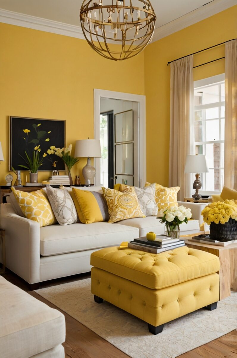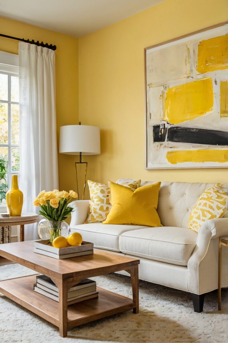 When accessorizing white furniture in yellow rooms, consider incorporating black accents for a sophisticated pop of contrast that grounds the lighter elements.