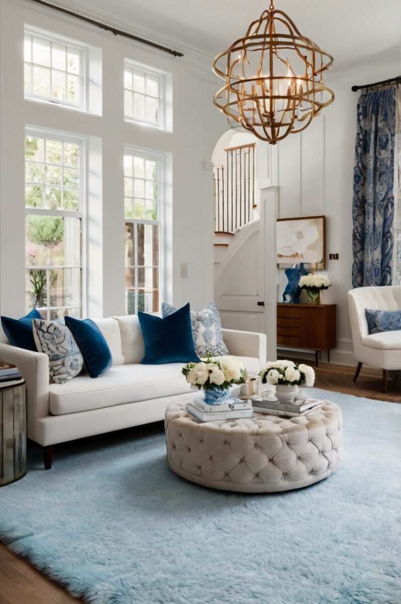 White walls create the perfect backdrop for your light blue carpet, offering a clean, timeless combination that never goes out of style.