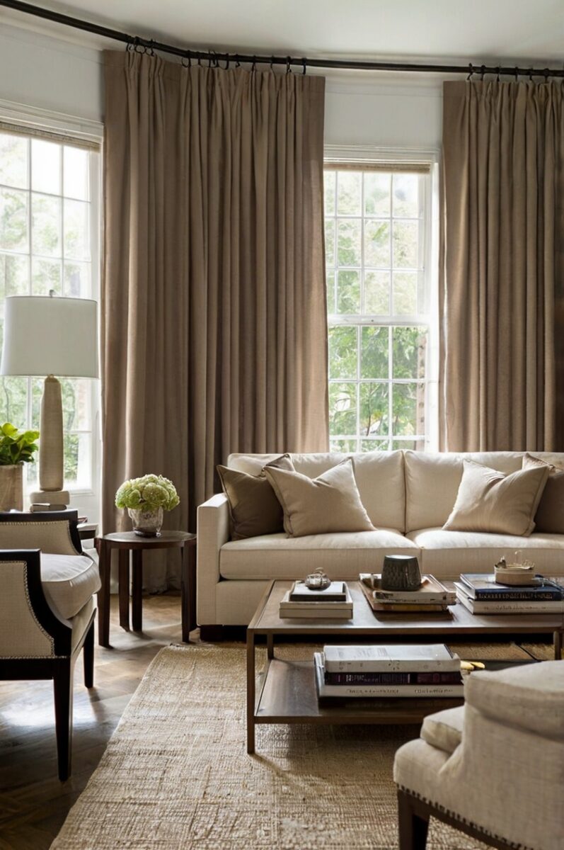 Think about a living room with bright white walls and those beautiful taupe curtains flowing down.
