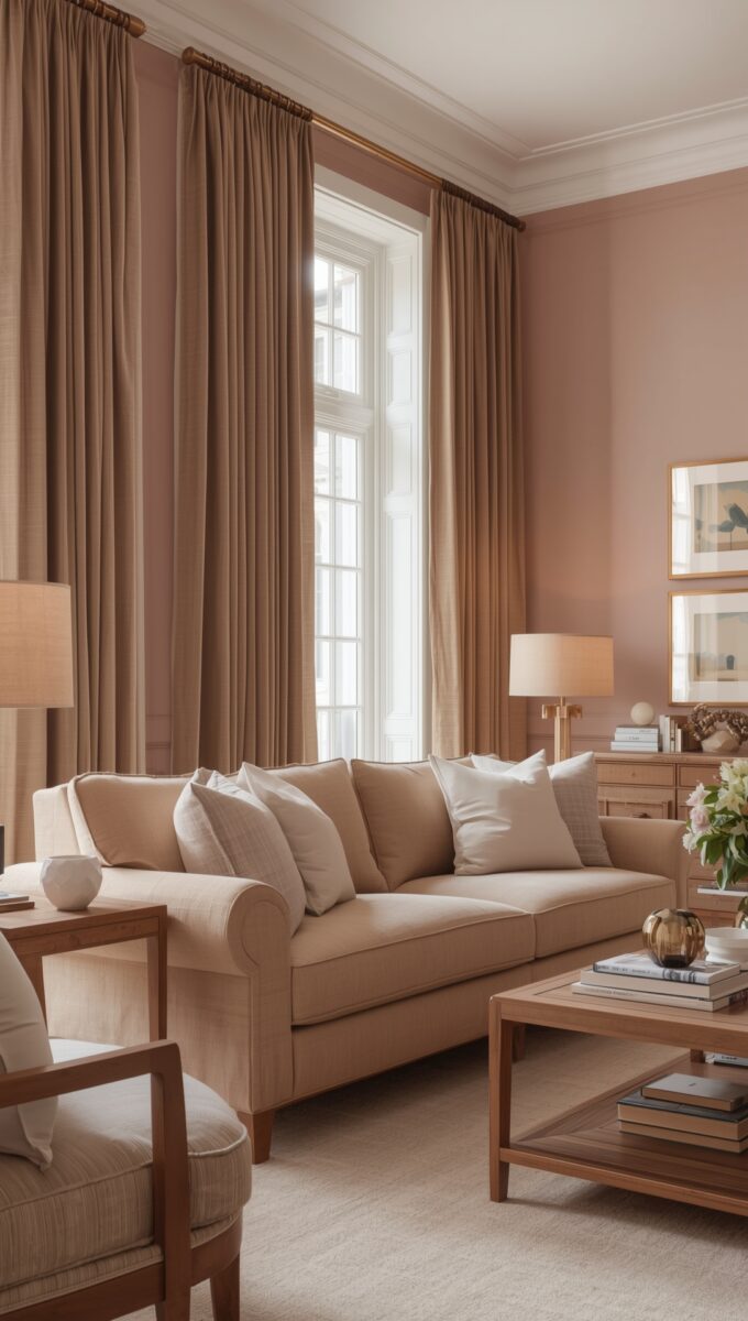 Blush pink floor-to-ceiling curtains against taupe walls look great with taupe furniture and blush pink accent pillows.