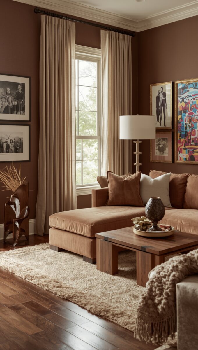 Think about a living room with warm brown walls and beautiful taupe curtains.