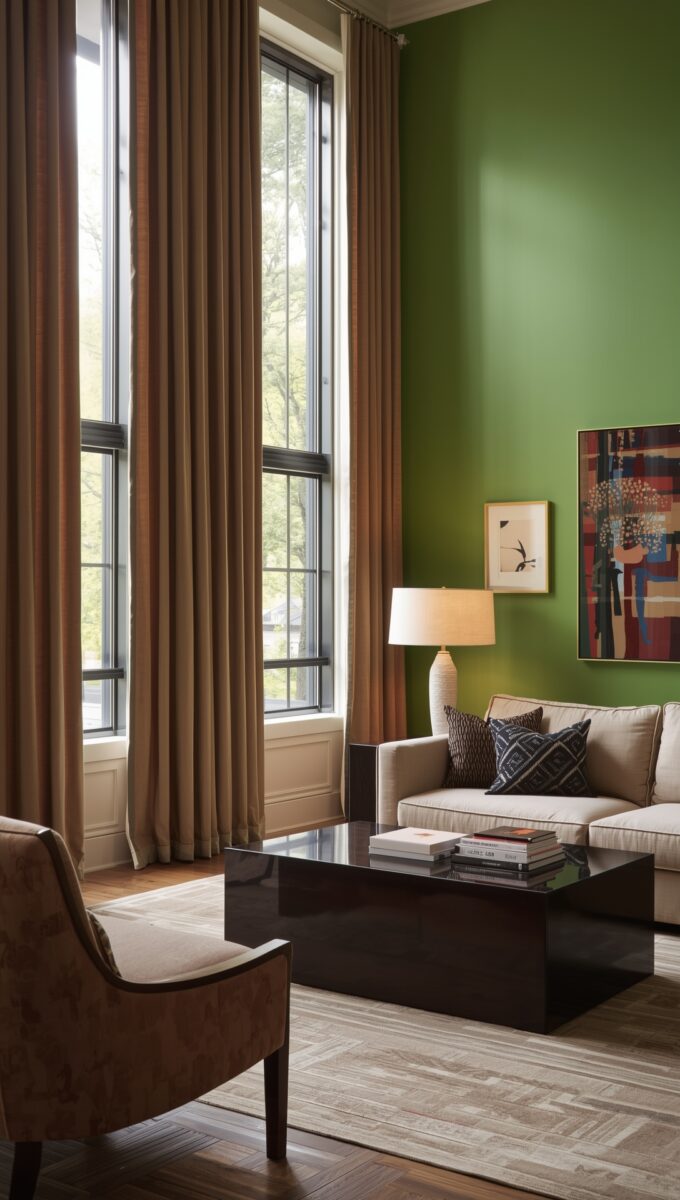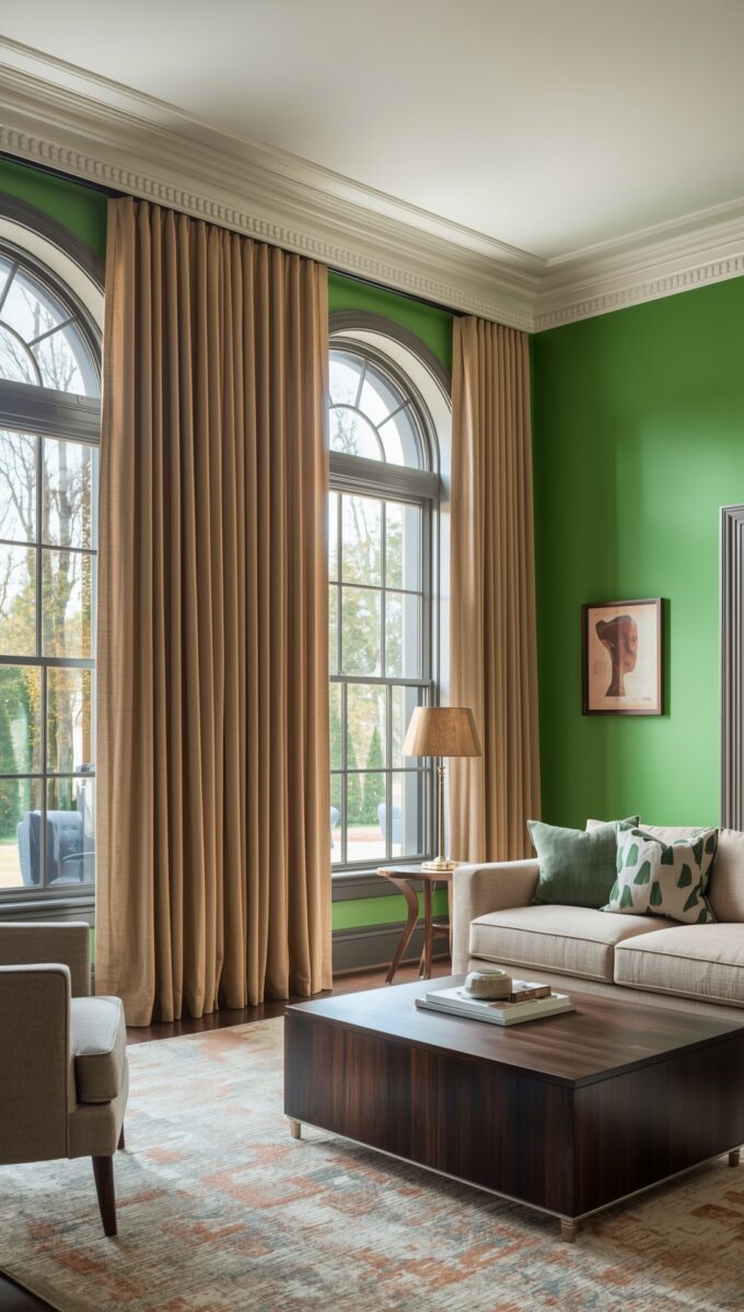 The taupe curtains will soften the intensity while still letting that gorgeous green shine.