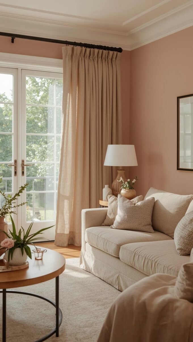 I love how the peachy-pink tones of coral bring out the warmth in taupe curtains.