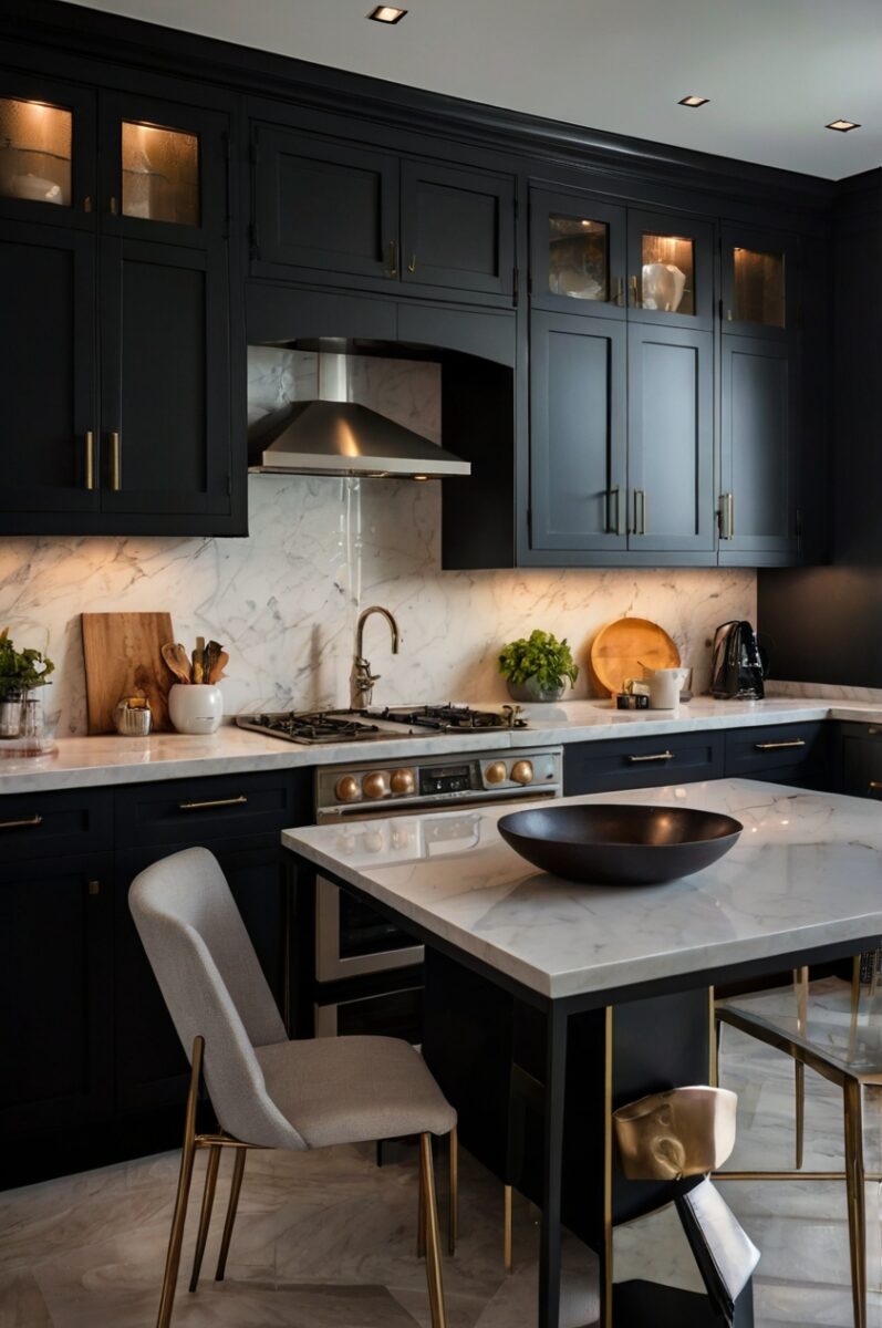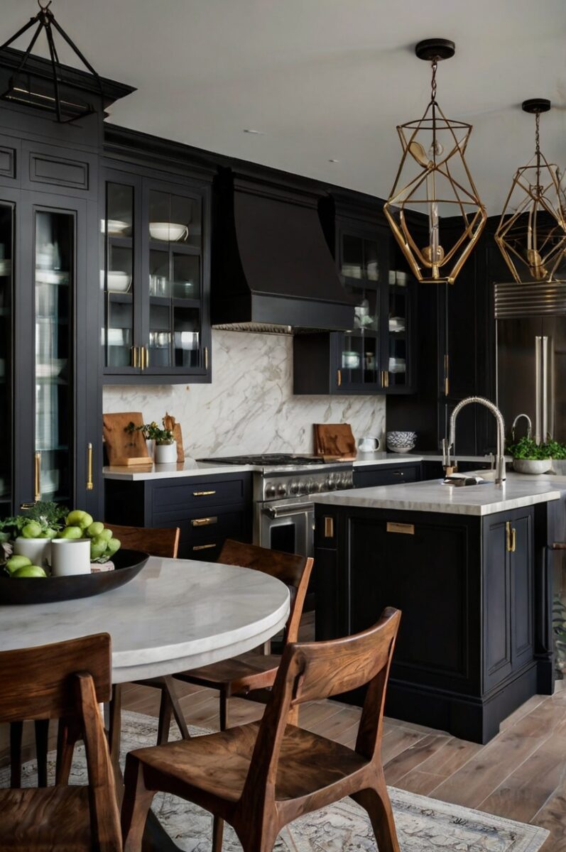 You might worry about a black table making your kitchen feel smaller, but strategic lighting and reflective surfaces can actually enhance the dramatic effect.