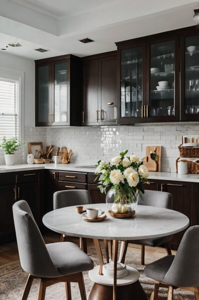 A crisp white farmhouse table adds rustic charm to your espresso cabinet kitchen.