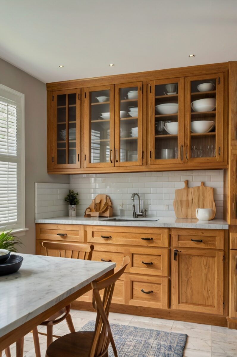 For busy households, consider frosted or textured glass which shows fewer fingerprints and water spots than clear glass while still providing that light, airy quality that works so well with honey oak cabinets.
