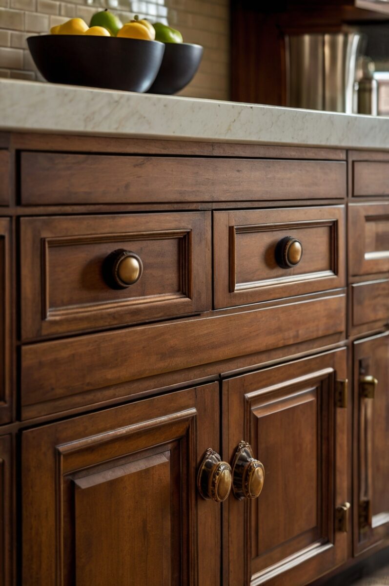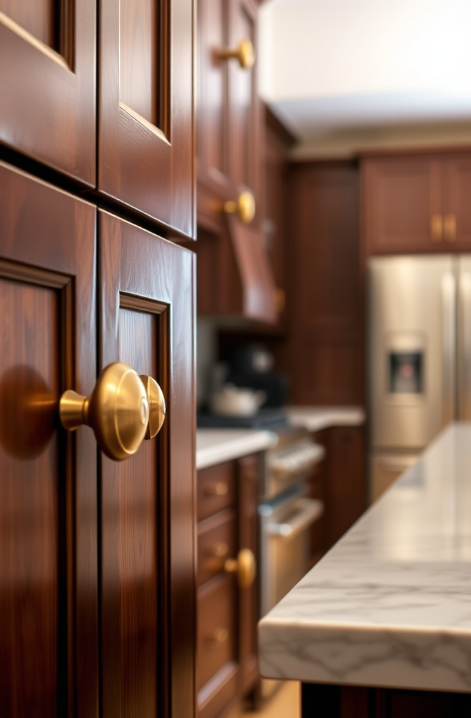 Burnished brass knobs create a rich, aged patina against brown cabinets that exudes old-world elegance.