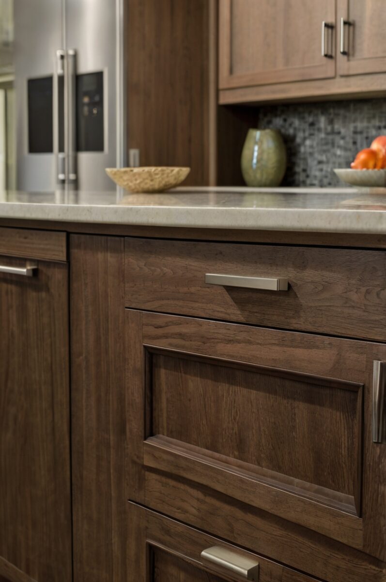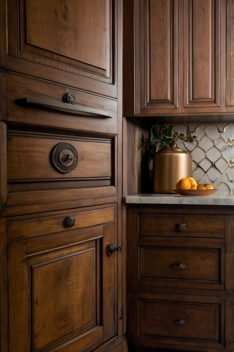 On lighter brown cabinetry, two-tone hardware adds visual weight and substance that anchors the design.