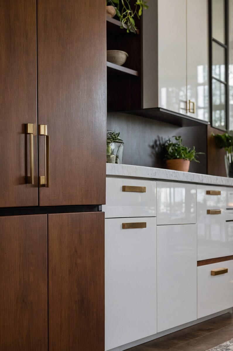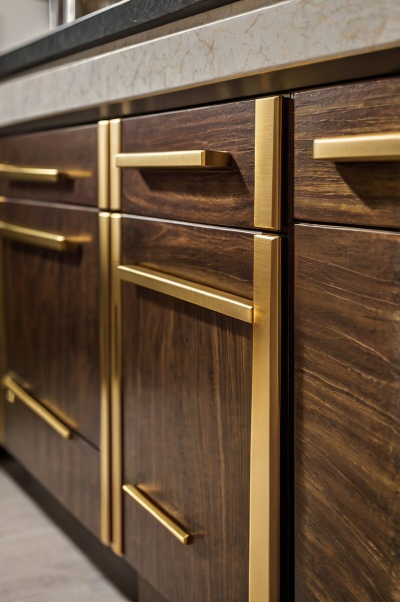 Lighting plays a crucial role in showcasing this pairing – under-cabinet lighting will make your gold knobs gleam beautifully against the brown backdrop.