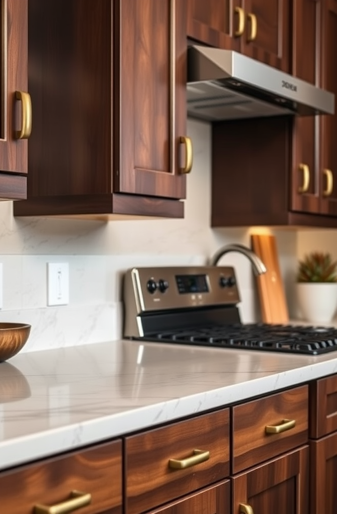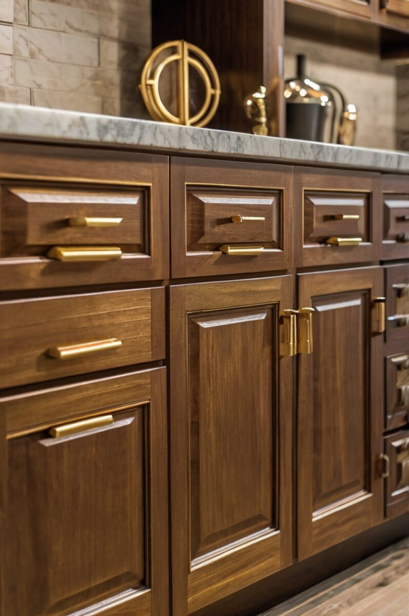 For medium to dark brown cabinets, gold hardware creates a rich, intimate feel perfect for creating cozy kitchen spaces.