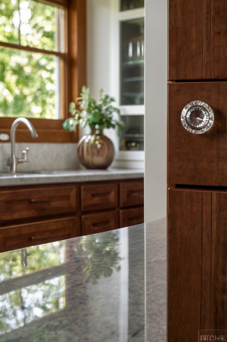 The warm tones of wood create a perfect canvas for experimenting with different knob finishes and colors.