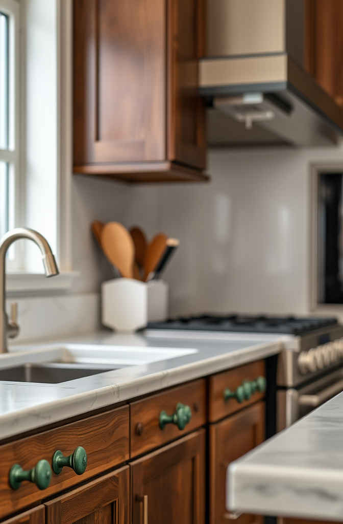 For darker brown cabinets, knobs featuring light and dark elements create dynamic contrast that prevents the overall look from feeling heavy.
