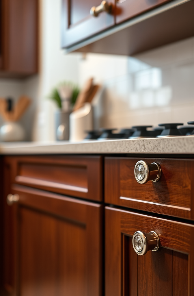 Silver chrome knobs create a striking contemporary edge when paired with traditional brown cabinets.
