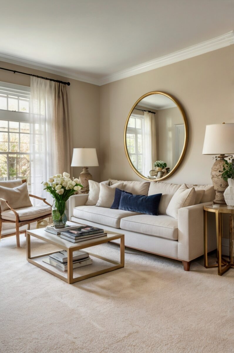 This combination feels modern yet timeless, avoiding the cooler grays that might clash with your carpet’s warmth.