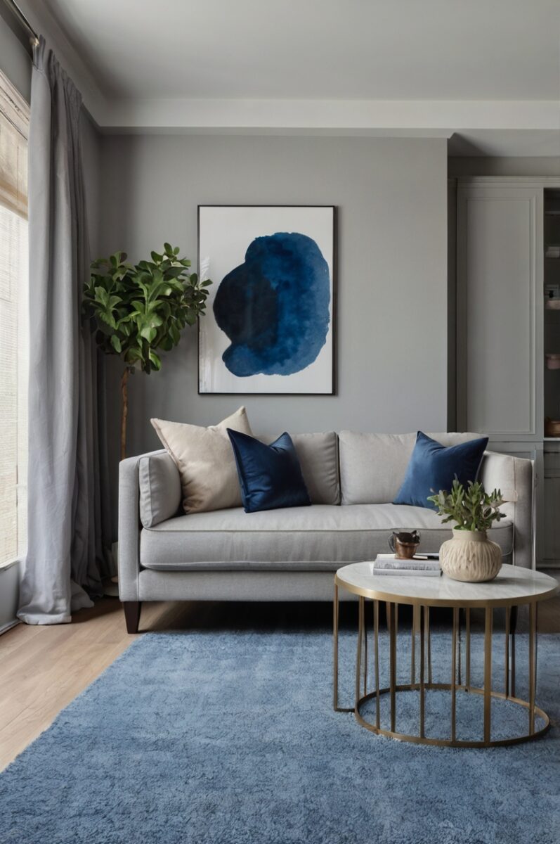 The gentle contrast between gray walls and blue carpet creates depth without being overwhelming.