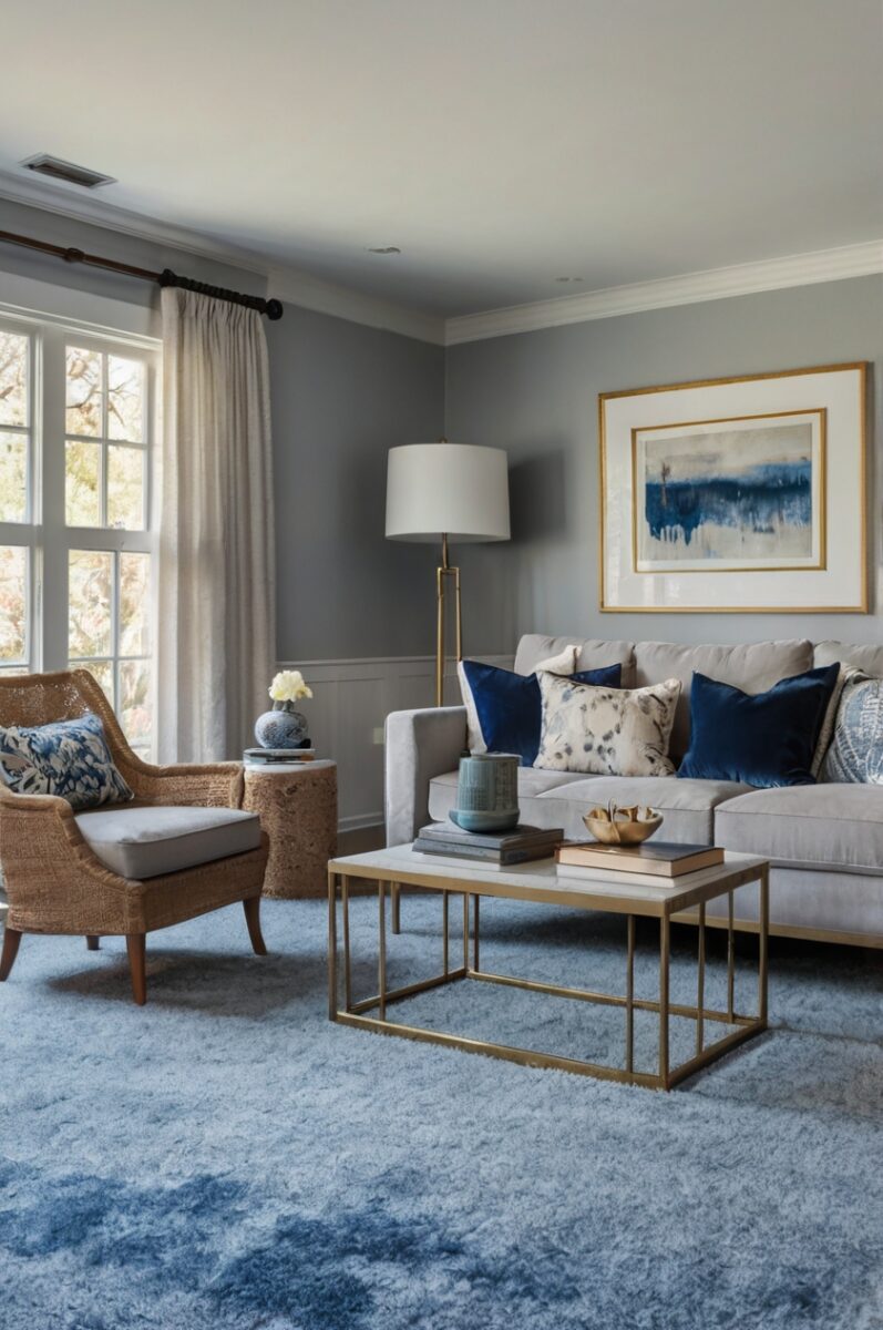 Soft gray is an awesome choice when you’ve got blue carpet in your home.