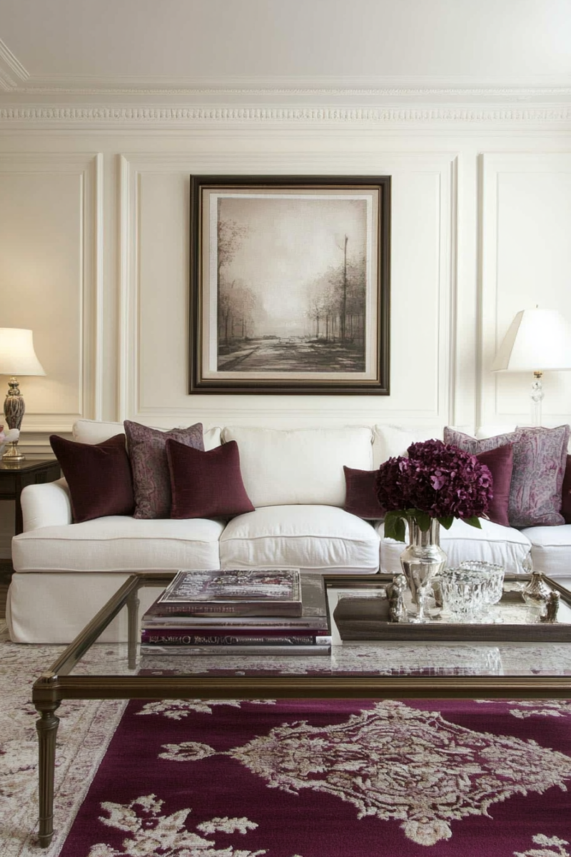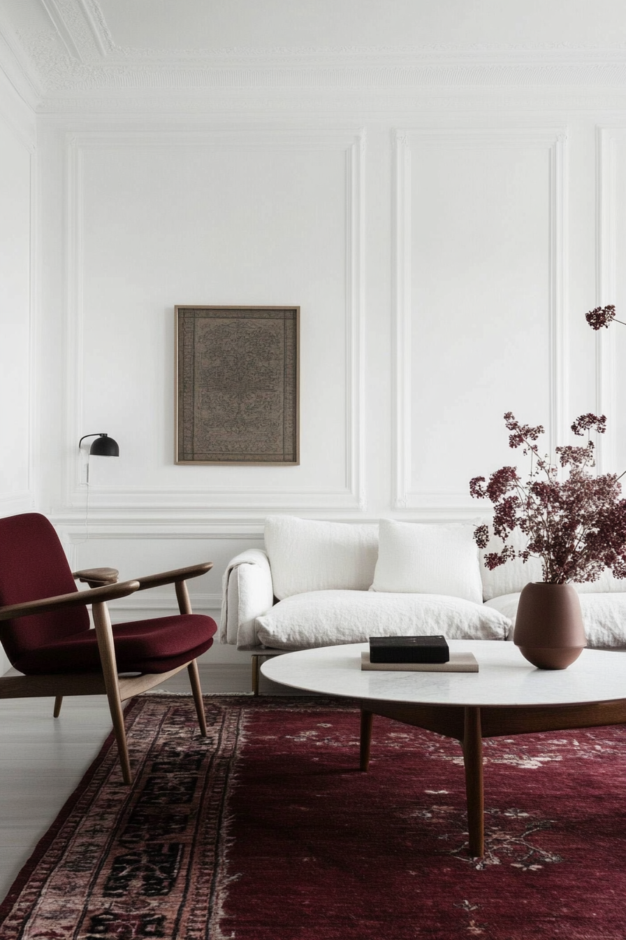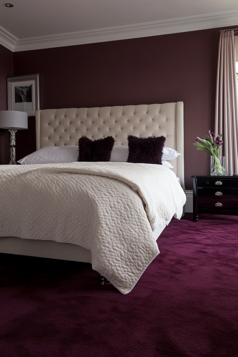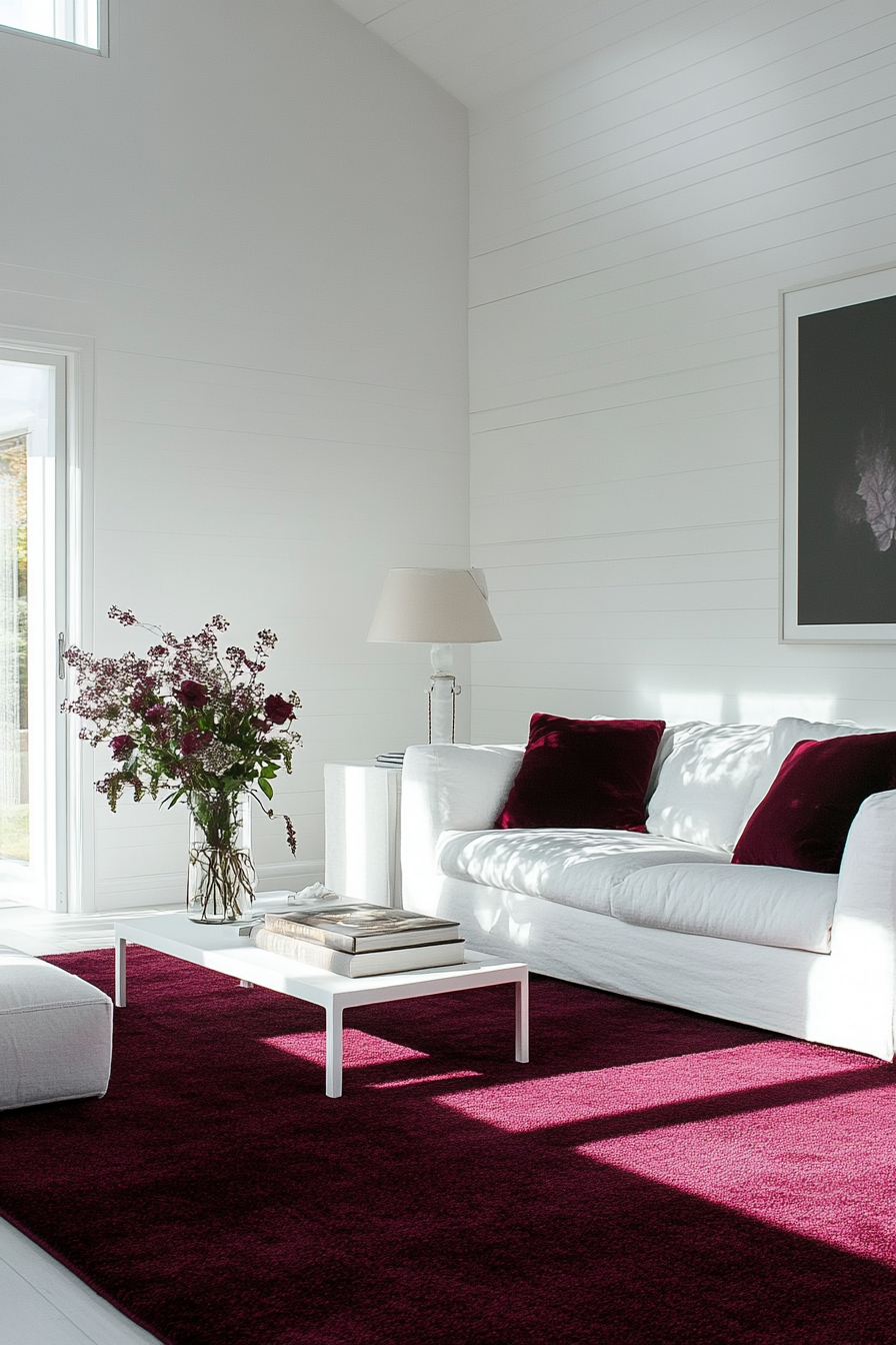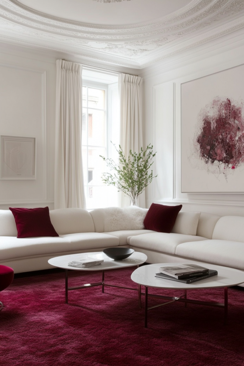 Creamy white is the ideal versatile neutral for making burgundy carpet glow beautifully.