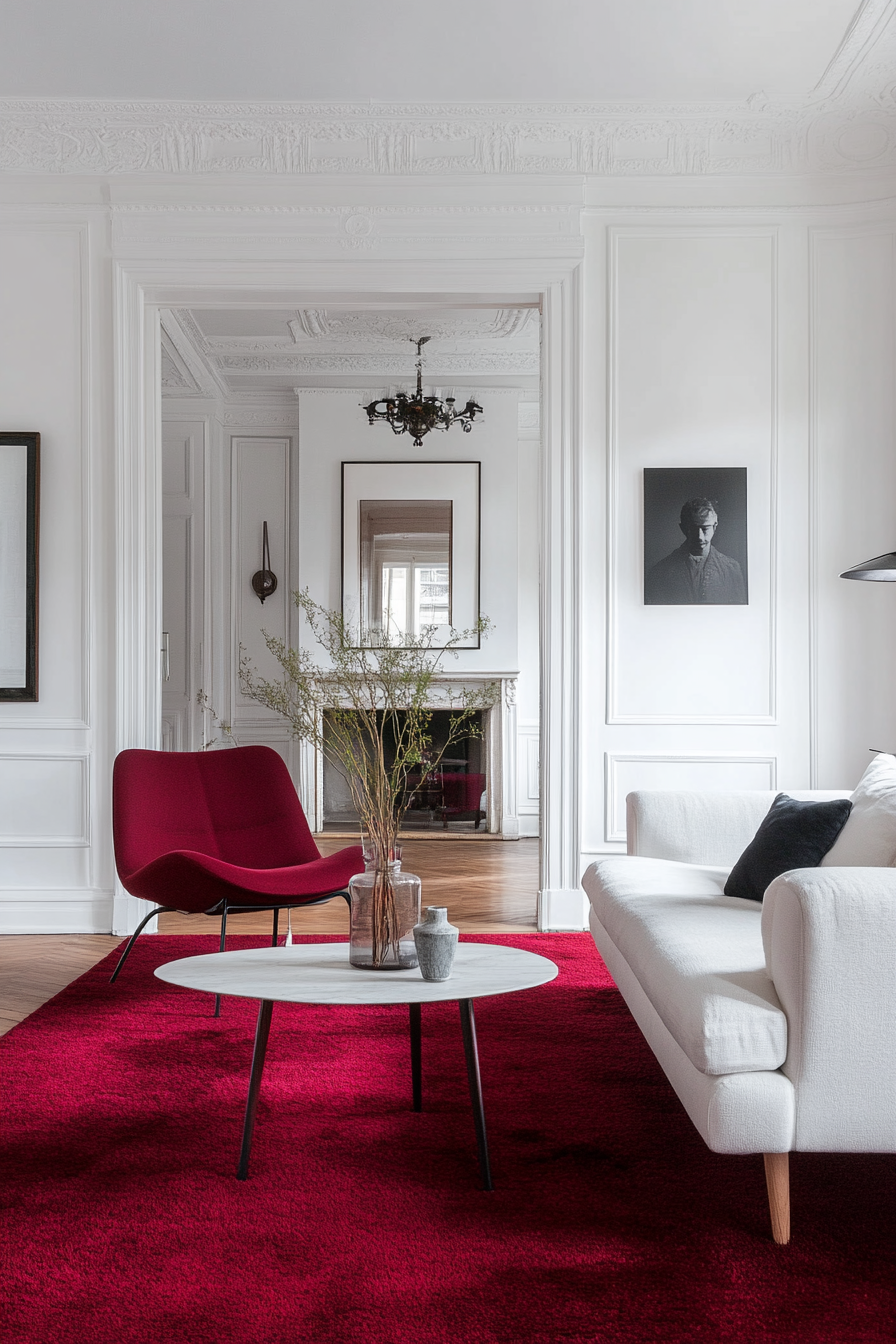 The bold white really accentuates the carpet’s rich color and adds light to balance the cozy warmth.